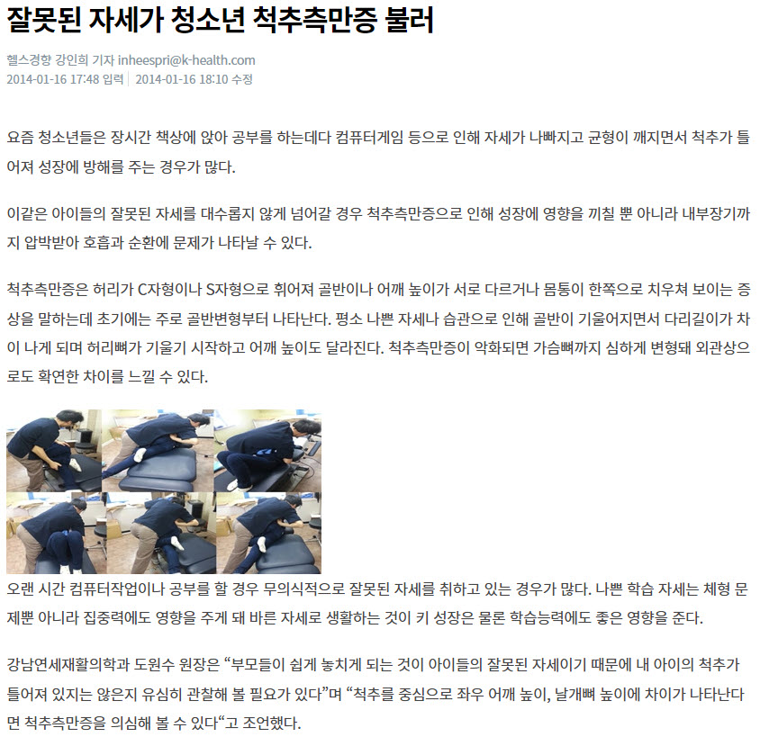 [언론] 잘못된 자세가 청소년 척추측만증 불러